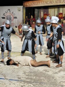 A composição do elenco reforçou o caráter comunitário da encenação. Havia participantes interpretando soldados e outros personagens ligados ao período representado, com uso de vestimentas inspiradas na época retratada, além de elementos de apoio como cordas e estruturas cênicas que contribuíam para a ambientação.